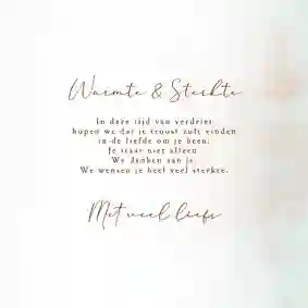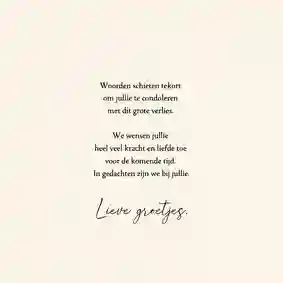 Het verlies van een geliefde is een van de meest verdrietige dingen die je kunt meemaken. De leegte die achterblijft vraagt om een persoonlijke attentie van vrienden, familie en bekenden. Door een mooie condoleance kaart te sturen laat je de nabestaanden weten dat ze niet alleen staan. Maak daarom een gecondoleerd kaart en laat weten dat je meeleeft met dit verlies.