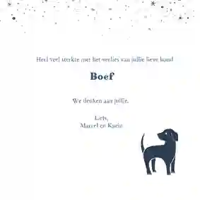 Om baasjes van dieren innige deelneming te betuigen met het verlies van een huisdier, kun je bij Kaartje2go een passende deelnemingskaart ontwerpen en verzenden.
