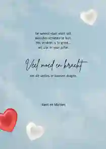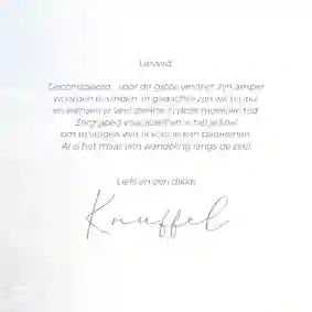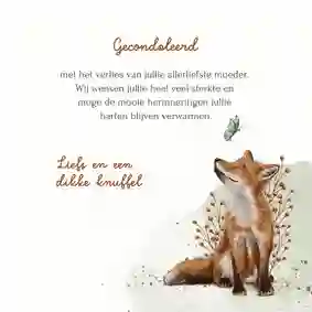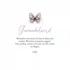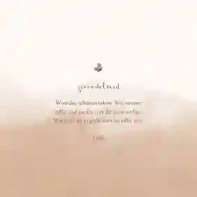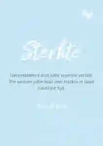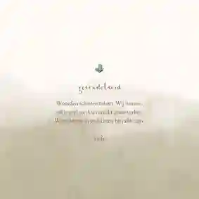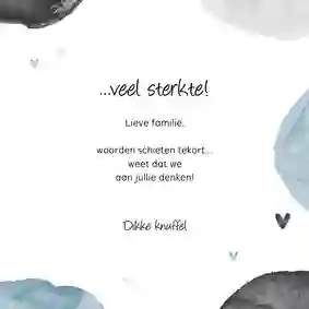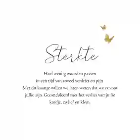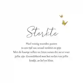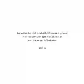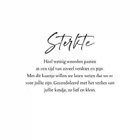 Vaak schieten woorden tekort na het overlijden van een kindje of baby. De woorden ‘We denken aan jullie!’ of ‘Sterkte’ zijn daarom al voldoende om neer te zetten. Je kunt er ook voor kiezen om een mooi gedichtje op te zoeken of het kaartje een persoonlijke twist te geven. Schrijf bijvoorbeeld dat je zijn of haar vrolijke lach gaat missen. Dit zullen de ontvangers vast erg waarderen!
