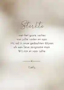 Met het sterven van JE/JULLIE lieve NAAM is er een groot verdriet in JE/JULLIE leven gekomen. Wij zijn in gedachten bij JE/JULLIE, vorige week, vandaag en in de toekomst.
