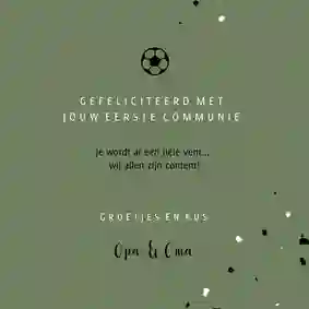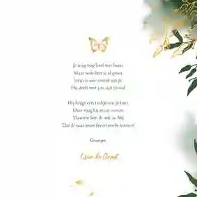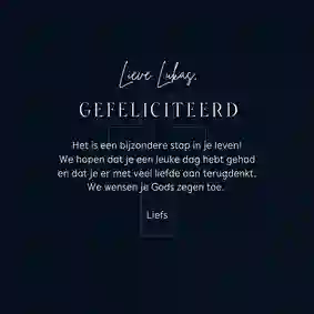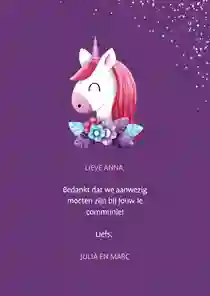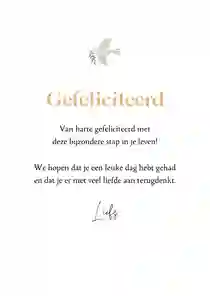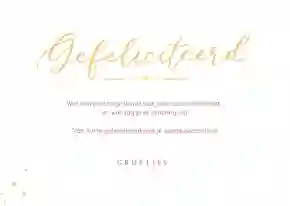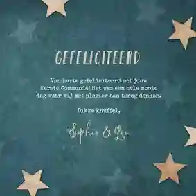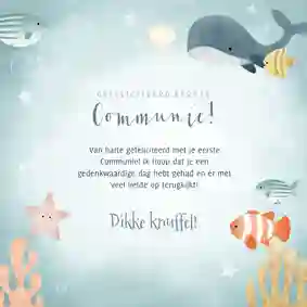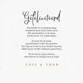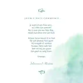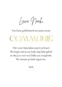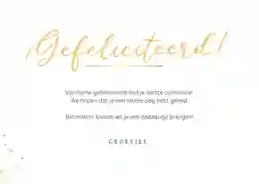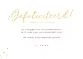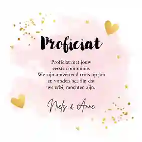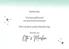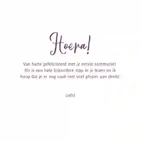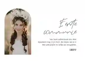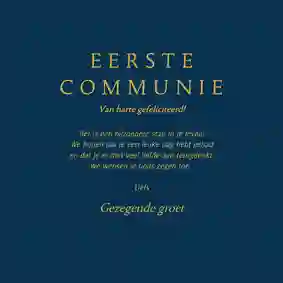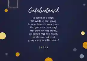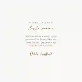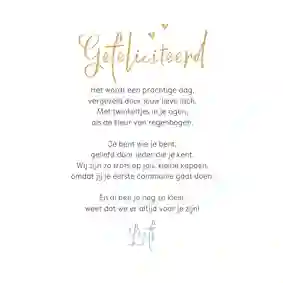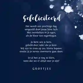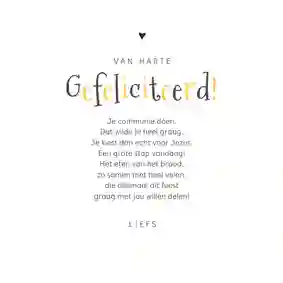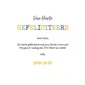 Neem ook gerust een kijkje tussen de ontwerpen van onze communiekaarten. De teksten op deze - en andere - kaarten kun je gemakkelijk aanpassen naar ‘gefeliciteerd’ of ‘proficiat’. In de binnenkant van de kaart is alle ruimte voor een persoonlijke felicitatie.