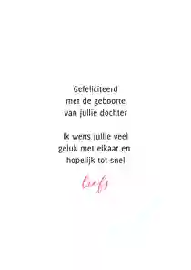 Bij Kaartje2go vind je voor elke gelegenheid een leuke felicitatiekaart. Wij hebben leuke kaarten voor de geboorte felicitatie van jongens en meisjes. Bekijk nu snel ons aanbod en feliciteer de vader en moeder met hun pasgeboren dochter of zoon.