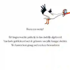 Na de bevalling en negen maanden zwangerschap is de baby eindelijk daar. Het kindje is geboren en het is tijd om de ouders te feliciteren. Een paar dagen nadat jouw kaart is aangekomen kun je zelf op visite en is het tijd voor beschuit met muisjes. Zo kun je de nieuwe wereldburger ontmoeten! Maak snel kennis met het lieve meisje of jongetje.