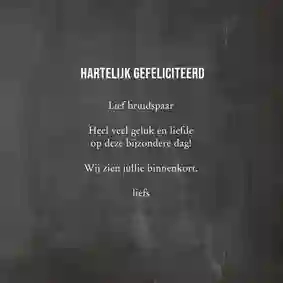Op hun trouwdag ontvangen de newly weds naast een tafel vol cadeaus ook tientallen kaarten. Stuk voor stuk met een mooi gedicht of een liefdevolle spreuk. Opvallen tussen al deze huwelijkswensen? Pik een kaart uit onze felicitatiekaarten en geef er een eigen draai aan.