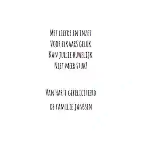 De leukste – maar lastigste – tekst is vaak zelf geschreven. De meeste mensen moeten hier even op broeden. Soms kan het lezen van bestaande gedichten en spreuken helpen een mooie tekst uit je vingers te krijgen. Daarom hebben we verschillende teksten voor op een huwelijkskaart voor je op een rijtje gezet.