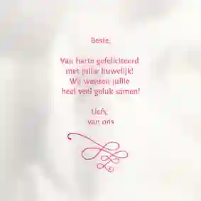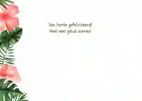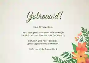 Hebben de tortelduifjes gekozen voor een intieme bruiloft? Of is het – om welke reden dan ook – niet mogelijk om bij het huwelijk aanwezig te zijn? Stuur de felicitatiewensen dan naar het getrouwde stel op. Net als voor elke andere kaart geldt: voor 21:00 uur ‘s avonds besteld = dezelfde dag verzonden.