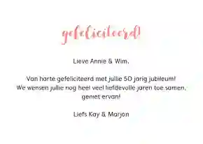 Een felicitatiekaart voor een huwelijksjubileum is heel origineel en gemakkelijk te maken bij Kaartje2go. Voor elk huwelijksjubileum is er wel een passende kaart. Bovendien zijn de felicitatiekaartjes van Kaartje2go helemaal niet duur.