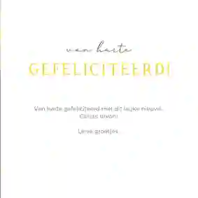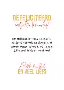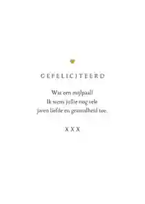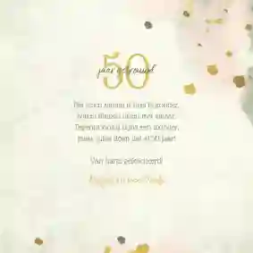 Een gouden huwelijk of vijftig jaar getrouwd is een uitgelezen moment om een leuke felicitatie te sturen aan het gelukkige koppel. Kijk eens tussen ons ruim aanbod aan felicitatiekaarten voor 50 jaar getrouwd en kies een toepasselijk kaartje uit met een persoonlijke touch.