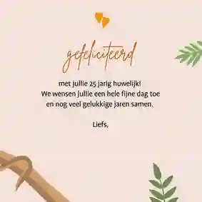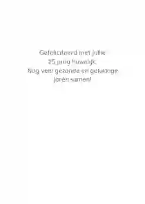 Het zilveren huwelijk van iemand is altijd een unieke gebeurtenis. Ben je niet echt vertrouwd met de feestvarkens die 25 jaar getrouwd zijn of weet je nog niet of je naar het 25-jarig huwelijksfeest kan gaan? Stuur dan een leuke 25 jaar getrouwd wenskaart met persoonlijke felicitaties. Onze designers ontwierpen een uitgebreid aanbod aan mooie kaarten voor deze gelegenheid. Je vindt dus zeker een kaart die je kan sturen.