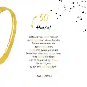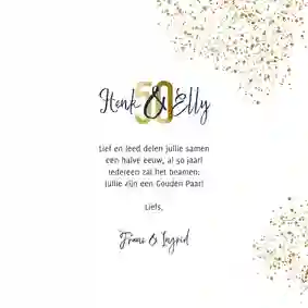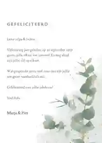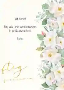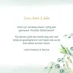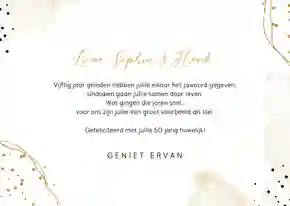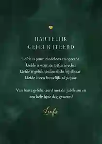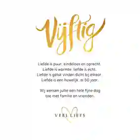 Een gouden huwelijk of vijftig jaar getrouwd is een uitgelezen moment om een leuke felicitatie te sturen aan het gelukkige koppel. Kijk eens tussen ons ruim aanbod aan felicitatiekaarten voor 50 jaar getrouwd en kies een toepasselijk kaartje uit met een persoonlijke touch.