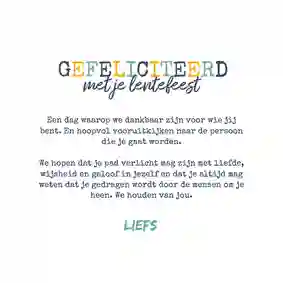 Onze designers doken in de wereld van lente- en groeifeesten en stelden de allermooiste kaartcollectie samen. Dit bijzondere moment vraagt natuurlijk om een vrolijk lentefeest kaartje met een liefdevolle felicitatie. Omdat het lentefeest plaatsvindt in het voorjaar, zie je op veel felicitatiekaartjes fleurige elementen terug. Denk bijvoorbeeld aan pastelkleuren, bloemen (narcissen), vlinders, fruit en dieren. De fotokaders in de ontwerpen geven je de mogelijkheid om een foto van het kind dat lentefeest doet toe te voegen.