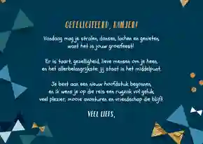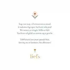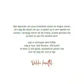 Je kunt ook nog kiezen voor een passende quote, een lief gedicht of een stukje songtekst wat je goed vindt passen bij de gelegenheid. Maak het zo persoonlijk mogelijk voor een extra betekenisvol gebaar.