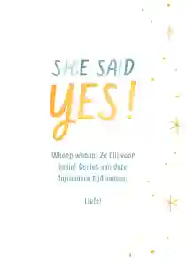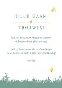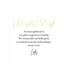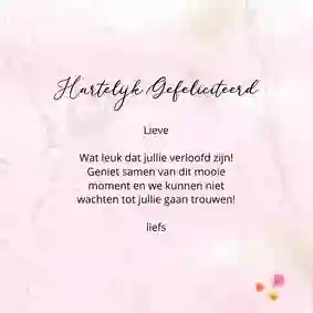 - Schrijf een leuke tekst in de kaart om het bruidspaar persoonlijk te feliciteren met hun verloving en trouwplannen.