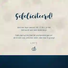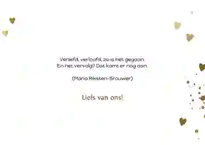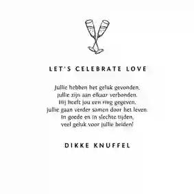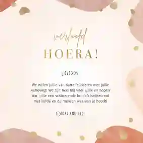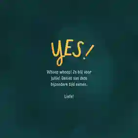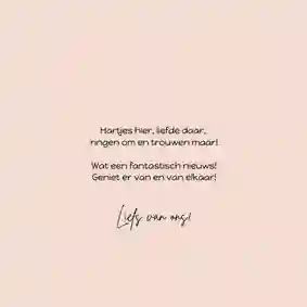 Natuurlijk kun je er ook een persoonlijke stukje bij zetten. Bijvoorbeeld hoe je altijd al had gedacht dat zij elkaar zouden vinden, of over dat gezellige etentje samen, of hoe je zag dat ze elkaar aankeken en toen wist dat ze perfect voor elkaar zouden zijn. Of een van de vele andere mooie verhalen die er te vertellen zijn. Ben je op zoek naar meer inspiratie? Lees dan ook ons blog Wat voor tekst zet je op een verlovingskaart?