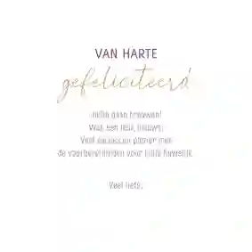 Een felicitatiekaart voor de verloving is natuurlijk pas compleet met een passende tekst erop. Feliciteer het aanstaande bruidspaar met hun voorgenomen huwelijk en wens ze meteen veel succes met de voorbereidingen. Dat kun je bijvoorbeeld doen met een van deze felicitaties: