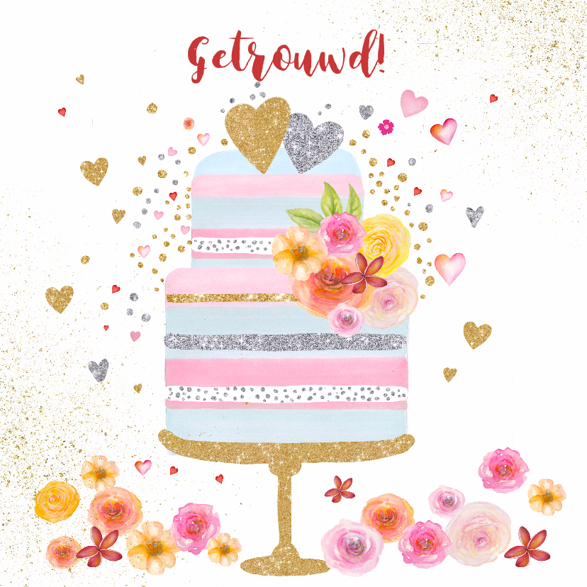 Felicitatie voor een huwelijk met romantische hippe taart in pastel en goud en zilverglitter niet echt gedrukt versierd met bloemen in aquarel