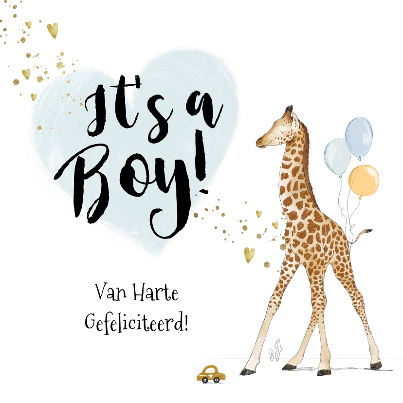 Felicitatiekaart geboorte zoon giraf hartjes goud spetters