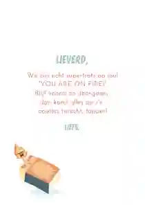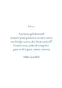 Je hebt een leuk kaartje gevonden en er een gave foto opgezet. Nu wil je een trotse tekst op de kaart schrijven. Maar wat zet je op de kaart? Er zijn verschillende invalshoeken en leuke mogelijkheden. Kies bijvoorbeeld voor een persoonlijke anekdote of een lief gedichtje. Of maak een persoonlijke tekst die recht uit het hart komt. Kun je wel een beetje hulp gebruiken? Lees dan onze voorbeeldteksten voor op een felicitatiekaart door. Je kan ze zo kopiëren op de kaart.