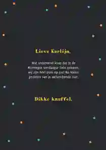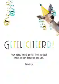 Je hebt een leuk kaartje gevonden en er een gave foto opgezet. Nu wil je een trotse tekst op de kaart schrijven. Maar wat zet je op de kaart? Er zijn verschillende invalshoeken en leuke mogelijkheden. Kies bijvoorbeeld voor een persoonlijke anekdote of een lief gedichtje. Of maak een persoonlijke tekst die recht uit het hart komt. Kun je wel een beetje hulp gebruiken? Lees dan onze voorbeeldteksten voor op een felicitatiekaart door. Je kan ze zo kopiëren op de kaart.