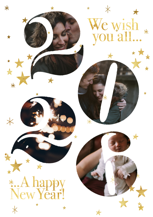Een kaart met foto's in de cijfers 2026. De goudlook sterren en typografie geven de kaart een feestelijke uitstraling. (Geen goud folie).