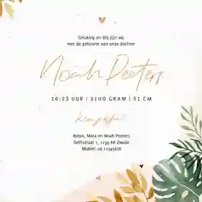Knappe katten, vrolijke vogels, knuffelige konijnen… Dieren hebben een plekje in ons hart veroverd. Daarom hebben onze ontwerpers hard gewerkt om een collectie te maken met dieren geboortekaartjes, speciaal voor jullie kleine dierenvriend. Kies bijvoorbeeld voor een geboortekaartje met dieren uit de jungle. Op deze geboortekaartjes staan veel groene details zoals planten en bloemen. Kijk je tussen de bladeren door, dan zie je een wereld vol speelse apen, schattige panda's, tropische vogels en exostische vlinders. Ook tijgers, panters en koala's zijn aanwezig op dit junglefeestje. Liever een rustiger geboortekaartje met dieren? Kijk dan eens bij onze collectie minimalistische geboortekaartjes en gebruik de filter ‘Dieren’. Deze geboortekaartjes hebben vaak een enkele achtergrondkleur en maar een of twee dieren op de voorkant. Welke stijl je ook kiest, er is altijd een geboortekaartje met dieren dat bij jullie en de kleine past.