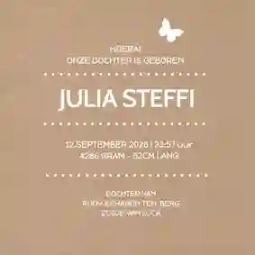 Hoera! Jullie zijn in verwachting van een kindje. Daarom zijn jullie nu op zoek naar een geboortekaartje waarmee jullie straks het blije geboortenieuws kunnen delen. Heb je al gedacht aan een geboortekaartje met fladderende vlinder? Kies een mooi ontwerp, bewerk de kaart en ontvang een gratis proefdruk.