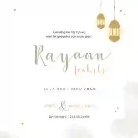 Babynieuws is het allermooiste nieuws dat je kunt delen. Met een islamitische geboortekaart laat je familie en vrienden weten hoe blij jullie zijn met dit wonder van Allah. Want als het geloof een belangrijke rol speelt in jullie leven, is het heel waardevol om dit terug te laten komen op jullie babykaartjes. In onze geboortekaartjes komen mooie elementen van de islam terug, zodat jullie geboorte-aankondiging straks helemaal bij jullie past.