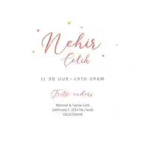 Mabrouk, er is een prachtig kindje geboren! Behalve voor geboortekaartjes, kun je bij Kaartje2go ook terecht voor leuke geboorte felicitatiekaartjes. Kies een kaartje uit die bij jouw stijl past en geef ‘m een eigen draai met een tekst, dua of toepasselijke figuren. Zo heb je een superpersoonlijke islamitische felicitatie voor de geboorte van een dochter of zoon.