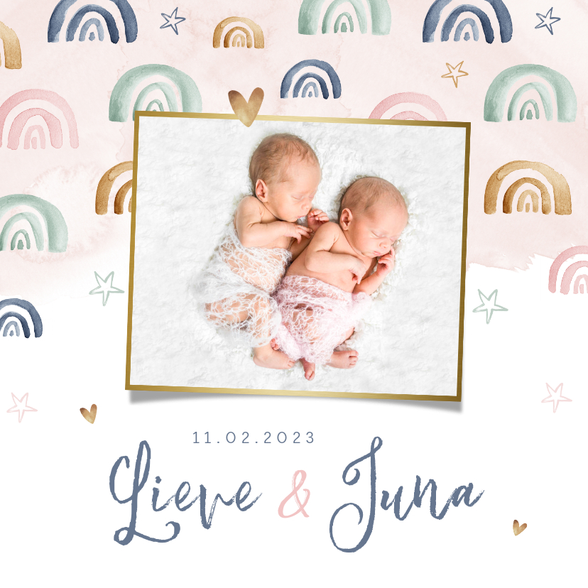 Hip en lief geboortekaartje voor een tweeling met waterverf regenboogjes, sterren en hartjes. Leuk met eigen foto op de voorzijde!