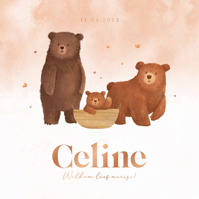 Een lief en origineel geboortekaartje met beren en vlinders. Met waterverf achtergrond.