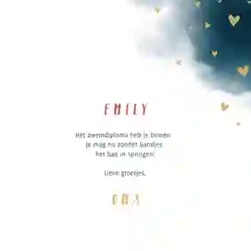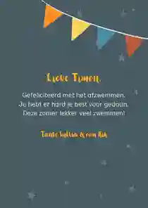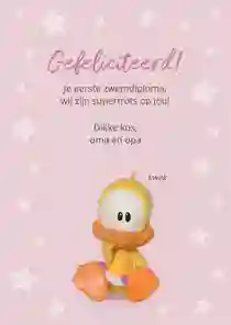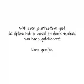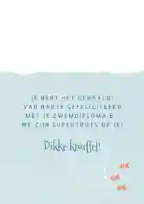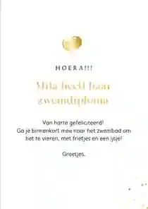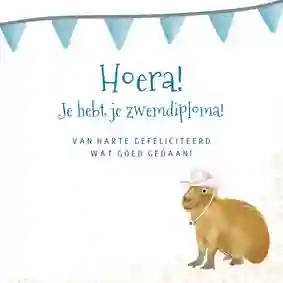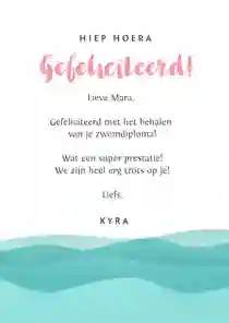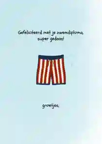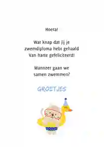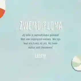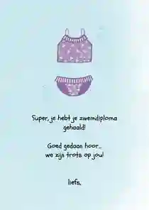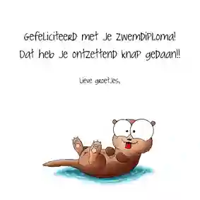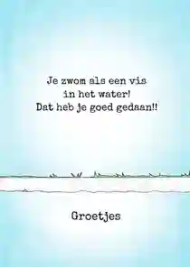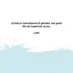 Je dochter of zoon, of je kleinkind misschien, heeft een zwembrevet behaald en je wilt hem of haar feliciteren. Dan kan je hier een keuze maken uit ons royale aanbod. Je maakt er hem of haar zeker heel blij mee en het is weer eens iets anders dan een geschenkje. Zeker als je de geslaagd-kaart voor het behalen van het zwembrevet op de post doet met Kaartje2go. Kinderen vinden het heel plezant om zo’n enveloppe met hun naam in de brievenbus te krijgen.