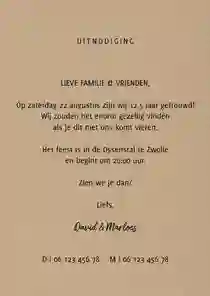 Het vieren van een koperen bruiloft wordt steeds populairder. Onze designers hebben daarom een flink aantal uitnodigingen aan onze collectie toegevoegd. Eén ding dat niet mocht ontbreken in deze prachtige kaarten? Koperkleurige elementen en accentkleuren als bruin en oranje natuurlijk! Deze uitnodigingen hebben een warme uitstraling en passen perfect bij een 12,5 jaar getrouwd feestje. Koper is namelijk hét materiaal dat bij een 12,5 jarig jubileum past en daarom kun je kaarten met koperfolie niet wegdenken uit onze collectie. De glanzende laag koper geeft je uitnodigingen namelijk echt de shine die jullie dag verdient!