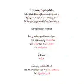 Als koppel zijn jullie uniek, dus het is ook helemaal aan jullie hoe dit fantastische 25 jarige jubileum gevierd wordt. Waar de een uitpakt met alle toeters en bellen, gaat de ander voor een intiem etentje. Gebruik daarvoor onze uitnodigingen voor een etentje. Mocht je toch voor een knalfuif gaan, denk dan ook alvast na over de bedankt kaartjes.