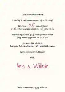 Een perfecte uitnodiging gevonden, en je (zilveren) pen al uit de kast gehaald? Dan is het tijd om je kaartjes te schrijven. De volgende informatie is onmiskaar op je 25 jaar getrouwd uitnodigingen: