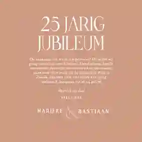 Als koppel zijn jullie uniek, dus het is ook helemaal aan jullie hoe dit fantastische 25 jarige jubileum gevierd wordt. Waar de een uitpakt met alle toeters en bellen, gaat de ander voor een intiem etentje. Gebruik daarvoor onze uitnodigingen voor een etentje. Mocht je toch voor een knalfuif gaan, denk dan ook alvast na over de bedankt kaartjes.
