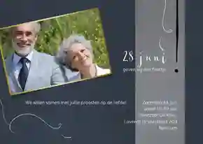 Bij Kaartje2go vind je de mooiste collectie 25 jarig jubileum kaarten van Nederland. Hier zit dus ongetwijfeld ook voor jullie zilveren huwelijk een perfect kaartje tussen. Met behulp van de filters vind je snel een kaart die bij jullie past. Filter bijvoorbeeld op thema en vind een kaart voor 25 jaar getrouwd met confetti, hartjes of champagne. Of filter op stijl voor een hippe en trendy uitnodiging, of een romantische, stoere, moderne of klassieke uitnodiging voor 25 jaar getrouwd zijn. Onze persoonlijke favorieten? De 25 jaar getrouwd kaartjes met foto. Deze speciale dag draait om jullie, en dat mag meteen vanaf de uitnodiging duidelijk zijn!