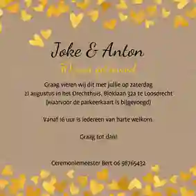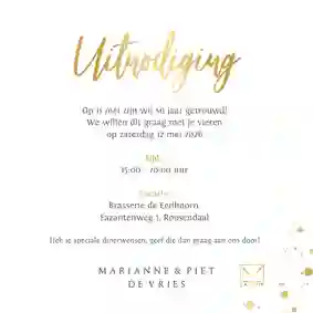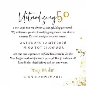 50 jaar getrouwd wordt ook wel het gouden huwelijk genoemd. Zo’n bijzondere liefdesmijlpaal verdient natuurlijk ook wel een bijzonder materiaal. Daarom bevatten veel van onze kaarten voor 50 jaar getrouwd gouden elementen. En onze ontwerpers gaan graag een stapje verder voor jullie speciale dag. Daarom hebben ze ook speciale uitnodigingen ontworpen met goudfolie! Deze fonkelende foliedruk details laten je 50 jaar getrouwd uitnodiging écht stralen.