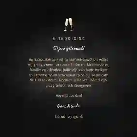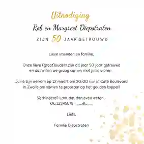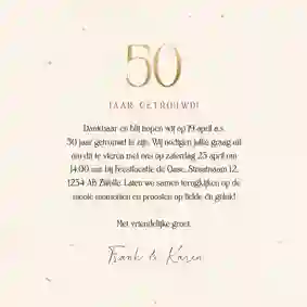 - Wat zet je op een kaart voor 50 jaar getrouwd? Jullie allermooiste foto! Dit maakt de uitnodigingen onwijs dierbaar en persoonlijk.