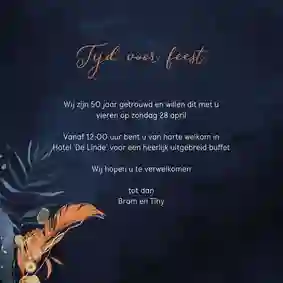 Jullie jubileum is natuurlijk een feestelijke gelegenheid. Daarom bevatten veel kaartontwerpen feestelementen, zoals ballonnen, confetti en slingers. Natuurlijk zijn de uitnodigingen voor het gouden huwelijk ook versierd met een sierlijke ‘50’, om jullie bijzondere jubileumjaar duidelijk te maken. Onze favoriete 50 jaar getrouwd kaart bevat natuurlijk een fotokader. Want het gouden koppel verdient een ereplaatsje op de uitnodiging. Je kunt ook kiezen voor een sierlijke jubileumkaart met bloemen rondom de 50, of een grappige 50 jaar getrouwd kaart met geinige illustraties.