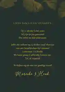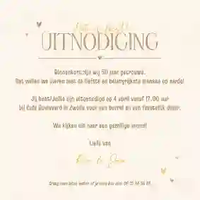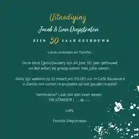 50 jaar getrouwd wordt ook wel het gouden huwelijk genoemd. Zo’n bijzondere liefdesmijlpaal verdient natuurlijk ook wel een bijzonder materiaal. Daarom bevatten veel van onze kaarten voor 50 jaar getrouwd gouden elementen. En onze ontwerpers gaan graag een stapje verder voor jullie speciale dag. Daarom hebben ze ook speciale uitnodigingen ontworpen met goudfolie! Deze fonkelende foliedruk details laten je 50 jaar getrouwd uitnodiging écht stralen.