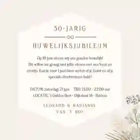 Jullie jubileum is natuurlijk een feestelijke gelegenheid. Daarom bevatten veel kaartontwerpen feestelementen, zoals ballonnen, confetti en slingers. Natuurlijk zijn de uitnodigingen voor het gouden huwelijk ook versierd met een sierlijke ‘50’, om jullie bijzondere jubileumjaar duidelijk te maken. Onze favoriete 50 jaar getrouwd kaart bevat natuurlijk een fotokader. Want het gouden koppel verdient een ereplaatsje op de uitnodiging. Je kunt ook kiezen voor een sierlijke jubileumkaart met bloemen rondom de 50, of een grappige 50 jaar getrouwd kaart met geinige illustraties.