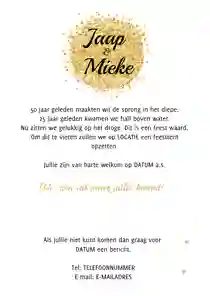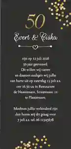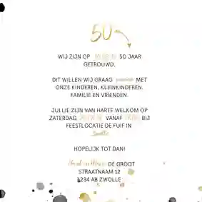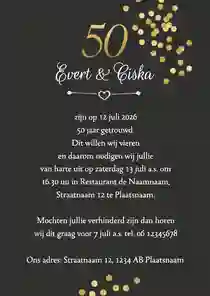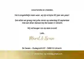 50 jaar getrouwd wordt ook wel het gouden huwelijk genoemd. Zo’n bijzondere liefdesmijlpaal verdient natuurlijk ook wel een bijzonder materiaal. Daarom bevatten veel van onze kaarten voor 50 jaar getrouwd gouden elementen. En onze ontwerpers gaan graag een stapje verder voor jullie speciale dag. Daarom hebben ze ook speciale uitnodigingen ontworpen met goudfolie! Deze fonkelende foliedruk details laten je 50 jaar getrouwd uitnodiging écht stralen.