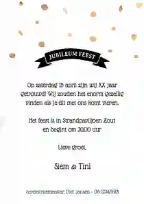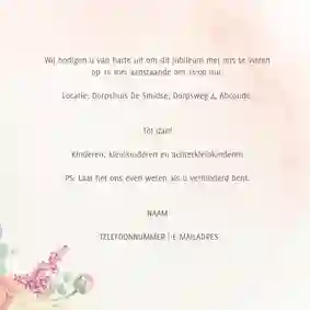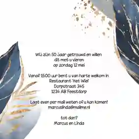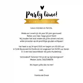 Jullie jubileum is natuurlijk een feestelijke gelegenheid. Daarom bevatten veel kaartontwerpen feestelementen, zoals ballonnen, confetti en slingers. Natuurlijk zijn de uitnodigingen voor het gouden huwelijk ook versierd met een sierlijke ‘50’, om jullie bijzondere jubileumjaar duidelijk te maken. Onze favoriete 50 jaar getrouwd kaart bevat natuurlijk een fotokader. Want het gouden koppel verdient een ereplaatsje op de uitnodiging. Je kunt ook kiezen voor een sierlijke jubileumkaart met bloemen rondom de 50, of een grappige 50 jaar getrouwd kaart met geinige illustraties.