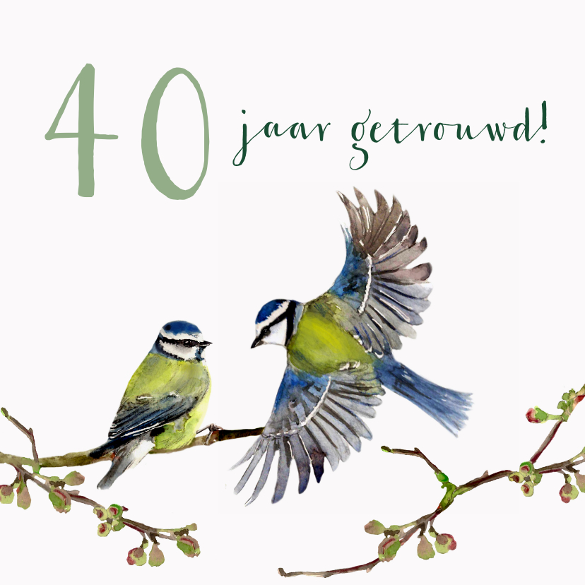 Een sfeervolle uitnodigingskaart voor een huwelijksjubileum. Op de voorkant 2 vogels op een tak. Gemaakt in aquarel.