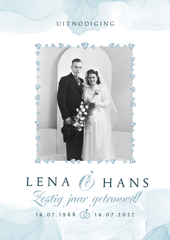 Een klassieke uitnodigingskaart voor een diamanten huwelijk met diamanten foto frame, waterverf achtergrond en eigen foto's.