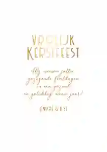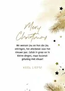 Geef de feestdagen een gouden randje en verstuur dit jaar een gouden kerstkaart. Kies voor een fonkelende kerstkaart met goudfolie of kaarten met een stijlvolle goudlook. De keuze is reuze en de ene kerstkaart schittert nog feller dan de ander. Al die pracht en praal past perfect bij kerstmis en de gezellige lampjes in de boom. Een kerstkaart met goud is ook een mooie keuze wanneer je iemand wat lichtpuntjes wilt sturen. Want een mooie gouden kerstkaart én jouw bemoedigende woorden, slepen je dierbaren de donkere dagen vast door.
