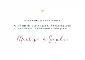 In onze collectie kerstkaarten vind je niet alleen kaartjes met goudfolie, maar ook kerstkaarten met goudlook. Onze designers hebben de kaartjes dan zo ontworpen dat het haast lijkt alsof ze echt goud hebben gebruikt. Dit maakt kerstkaarten met goud ontzettend stijlvol en chic. In de kerstkaarten zie je bijvoorbeeld veel sterren terug. Ook goudkleurige hartjes en sneeuwvlokken sieren veel kerstkaartjes. In de kaartmaker kun je trouwens helemaal los met de goudkoorts. Kies bijvoorbeeld voor goudkleurige fotokaders, gouden letters of figuren met goud. Daarnaast kun je in je tekst aandacht geven aan deze bijzondere kerstige kleur, met een tekst als ‘je bent goud waard’ of 'ik wens je veel lichtpuntjes'. Kortom, het is alles goud wat er blinkt.
