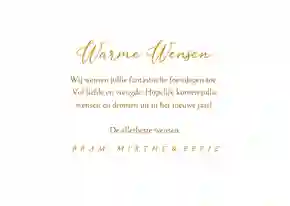Kan het jou niet glamourous genoeg zijn? Dan is een foliedruk kerstkaart echt iets voor jou. Deze kerstkaarten zijn voorzien van een glanzend laagje goudfolie. De details op je kerstkaart stralen je daardoor letterlijk tegemoet. Op kerstkaarten met veel wit en zwart komt het goud extra mooi uit. Wanneer je de kerstkaart beweegt glinstert het goudfolie in het licht. Met deze gouden kerstkaarten bezorg je je dierbaren een extra dosis kerstgevoel.