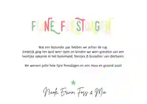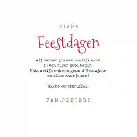 Onze designers gingen te rade bij hun innerlijke kind en hebben de allermooiste collectie kerstkaarten voor kinderen ontworpen. Denk bijvoorbeeld aan kerstkaartjes in felle kleuren en met vrolijke kleurcombinaties. Maar ook schattige dieren zoals rendieren, katten, beertjes en muizen. De karakteristieke kerstfiguren (zoals je ze ook in kinderboeken ziet) kunnen ook niet ontbreken, dus ook kerstkaartjes met de kerstman, Rudolf, sneeuwpoppen en gemberkoekmannetjes zijn van de partij. En we hebben kerstkaartjes met Fien en Teun voor kleine kindjes, maar ook stoere dino kerstkaarten voor de grote kiddo’s.