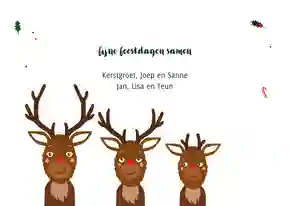 Onze designers gingen te rade bij hun innerlijke kind en hebben de allermooiste collectie kerstkaarten voor kinderen ontworpen. Denk bijvoorbeeld aan kerstkaartjes in felle kleuren en met vrolijke kleurcombinaties. Maar ook schattige dieren zoals rendieren, katten, beertjes en muizen. De karakteristieke kerstfiguren (zoals je ze ook in kinderboeken ziet) kunnen ook niet ontbreken, dus ook kerstkaartjes met de kerstman, Rudolf, sneeuwpoppen en gemberkoekmannetjes zijn van de partij. En we hebben kerstkaartjes met Fien en Teun voor kleine kindjes, maar ook stoere dino kerstkaarten voor de grote kiddo’s.